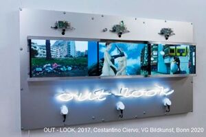 Aus seiner Sammlung präsentiert das museum FLUXUS+ in der Sonderausstellung COSTANTINO CIERVO: OUT – LOOK bislang nicht gezeigte Arbeiten des in Berlin lebenden Italieners Costantino Ciervo. Der Maler, Grafiker und Medienkünstler wurde in seiner Jugend vom politischen Klima in den 70er Jahren in Neapel geprägt, was vielleicht die Frage beantwortet, warum gesellschaftspolitische Themen für ihn so zentral sind. Zu Beginn der 1990er Jahre begann Ciervo mit technischen Apparaturen zu experimentieren und nahm an der Biennale von Venedig mit einer interaktiven Skulptur teil. Den Künstler treibt stets die Frage an, ob und wie in einer Welt voller Individualismus und Paradoxie Ausgleich und Harmonie geschaffen werden können. Die Ausstellung schlägt einen Bogen von Ciervos Tätigkeit als Maler und Zeichner im Berlin der 1990er Jahre hin zu seinen aktuellen, technikbasierten Objekten. Die Zusammenschau dieser technisch/medial sehr unterschiedlichen Arbeiten zeigt die konstante Beschäftigung mit politischen, wie ästhetischen Fragestellungen. Die empfindliche Papierarbeit Hommage an Marcuse (1990), die nur für kurze Zeit gezeigt werden kann, stellt eine Auseinandersetzung mit dem für die Kunst der Nach-kriegszeit wichtigen Vertreter einer post-marxistischen Ästhetik dar. Sie steht der titelgebenden, auf der partizipativen Smartphone-App „Send Protest“ basierenden, 3-Kanal-Videoskulptur out–look gegenüber. Die Videoskulptur gehört zu den neuesten Erwerbungen des Museums und kann als Interpretation der Utopien Marcuses und als Statement zur Demokratisierung in der Kunst gelesen werden. Die Zeitlosigkeit der Arbeiten Ciervos begründet sich aus ihrer Widmung für existen-zielle Fragen der Menschheit heraus. Das ästhetische Spiel mit den Technologien unserer Zeit steht im Zusammenhang mit dem menschlichen Bewusstsein in einer vom Kapitalismus geprägten Welt. Auch Dokumentationen seiner Performances zeigen oftmals groß angelegte, mit Technologie ausgestattete Settings und erinnern in ihrer Ironie und Publikumsbeteiligung an Happenings der Fluxus-Bewegung. Den „revolutionären“ Protest-Charakter der Kunst (Marcuse) jedoch, der darin bestehe, durch die Macht der Phantasie und des Eros die Gesellschaft zu transformieren, verkörpert Ciervos Arbeit auf mehr oder weniger explizite Weise, indem er die politischen Inhalte formal analysiert und ihre ästhetischen Elemente mit der Haltung eines politischen Statements präsentiert.